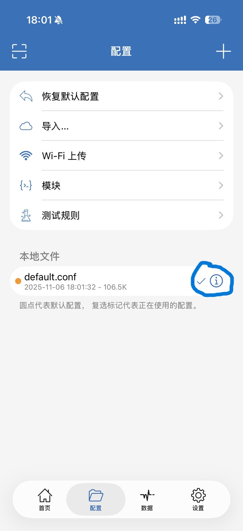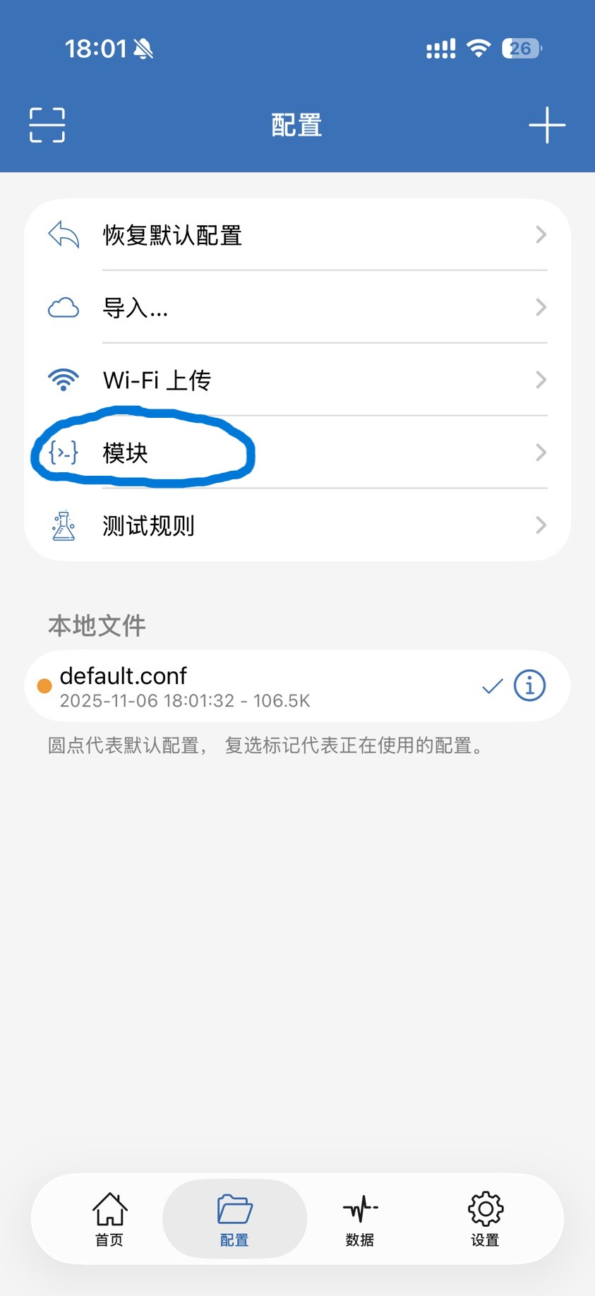 打开 ShadowRocket 主页,点击下方的【配置】,点击【模块】: