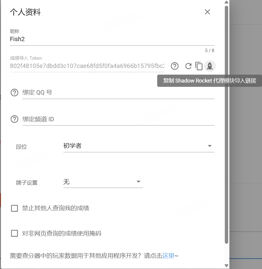打开查分器网页,前往【编辑个人资料】界面,点击导入 Token 右侧的小火箭图标复制链接: