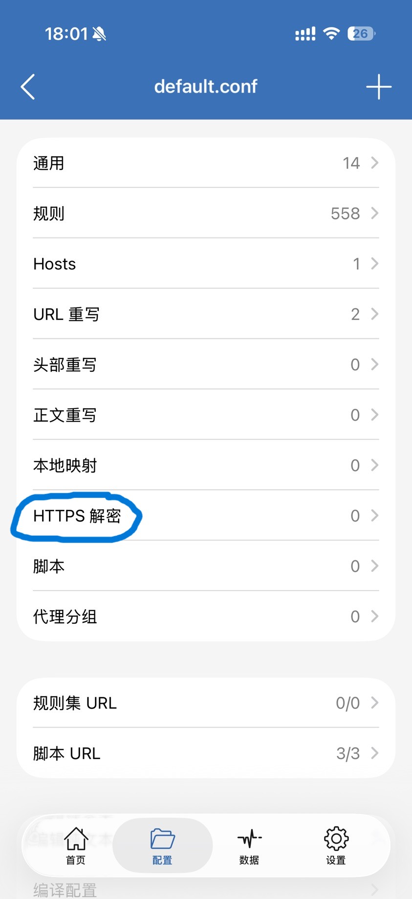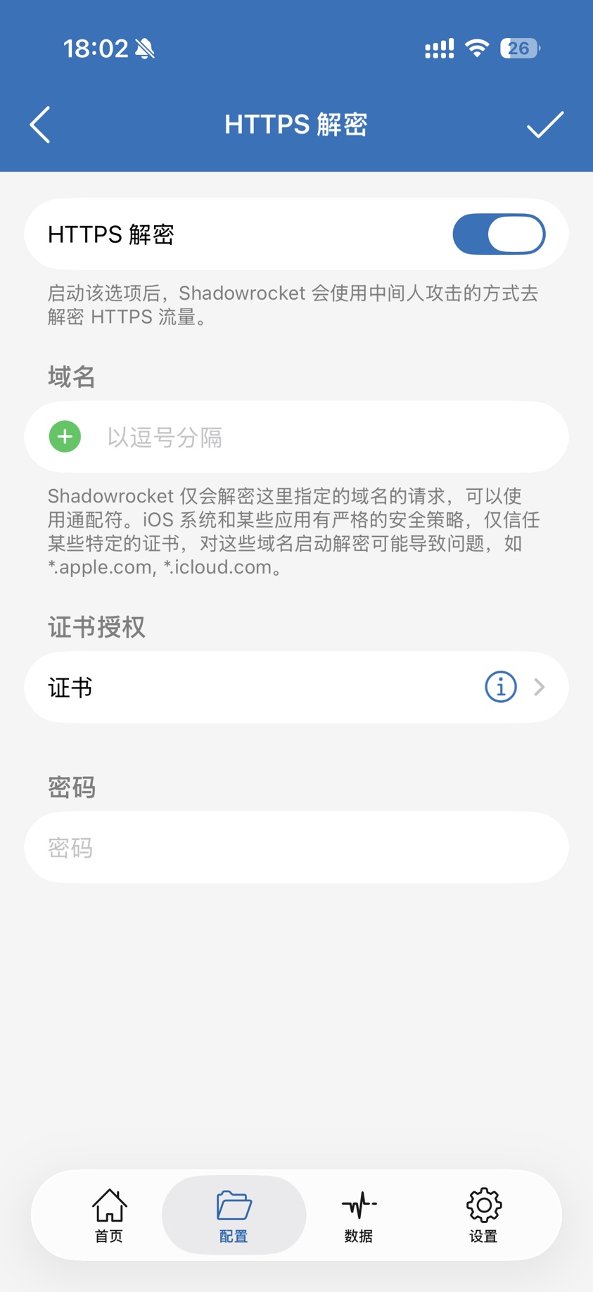 打开 ShadowRocket 主页,点击下方的【配置】,点击本地文件打勾的配置右边的圈i,进入之后点击【HTTPS 解密】