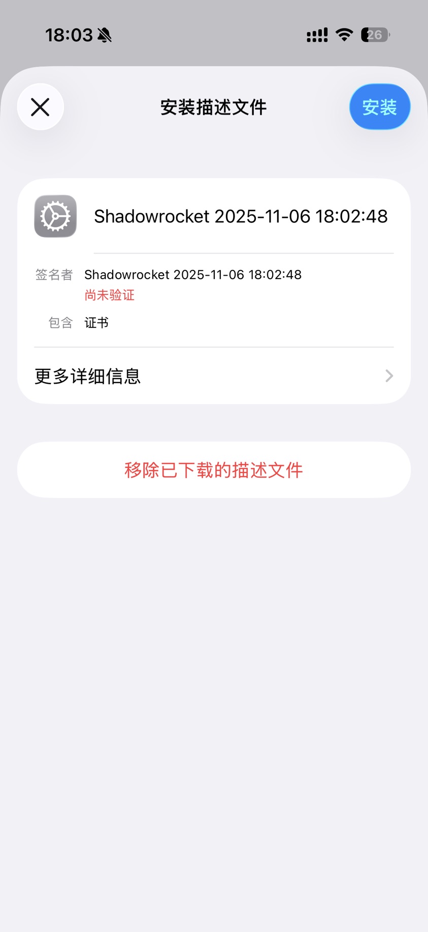 点击证书 -> 安装证书,系统会跳转到安装描述文件,点击右上角的【安装】