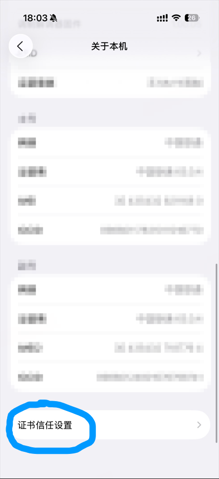 之后,前往设置 -> 关于本机,划到最下面,点击证书信任设置,信任刚刚添加的 ShadowRocket 证书: