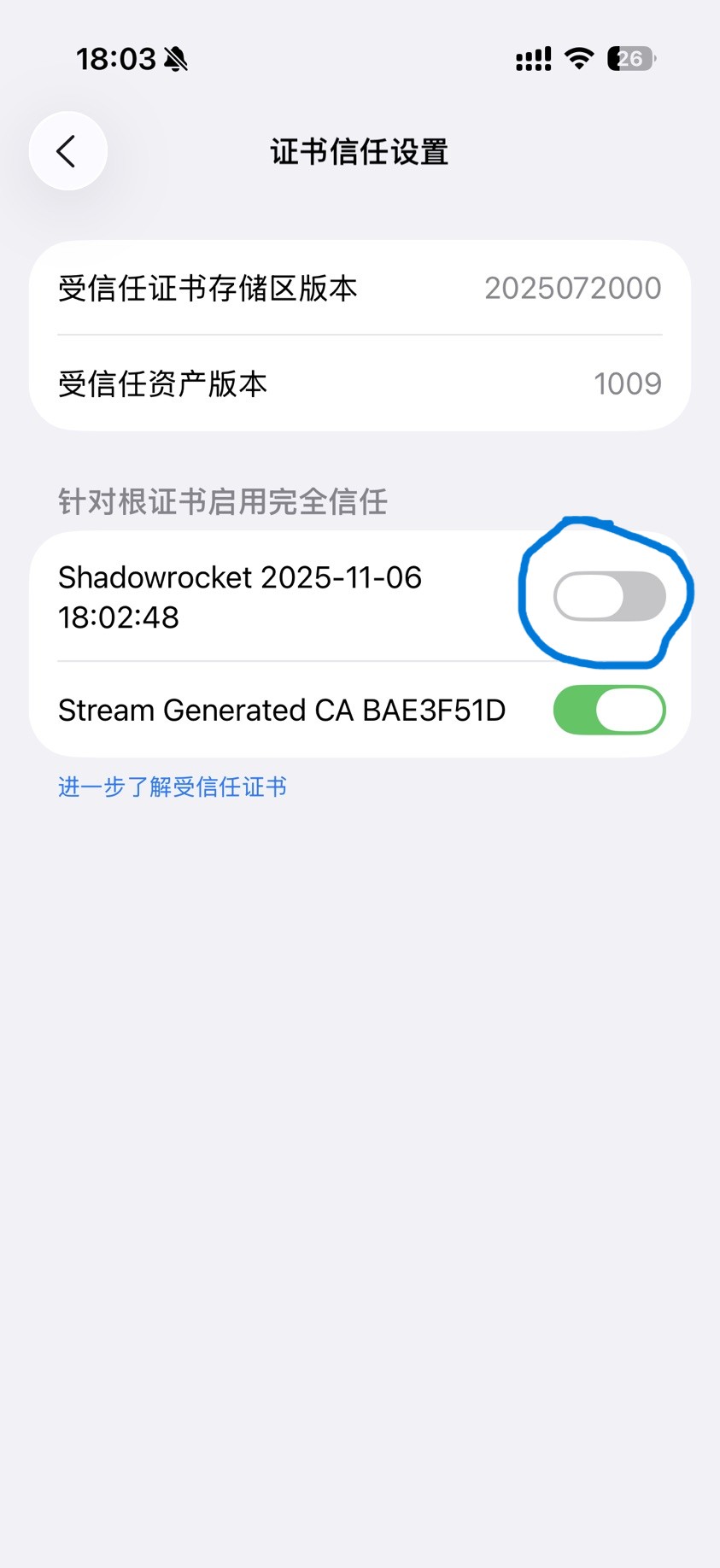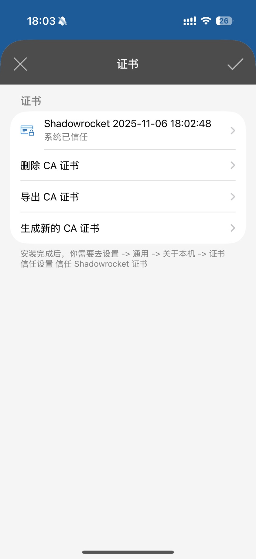 回到 ShadowRocket 界面,应该会显示证书已信任,如下图所示: