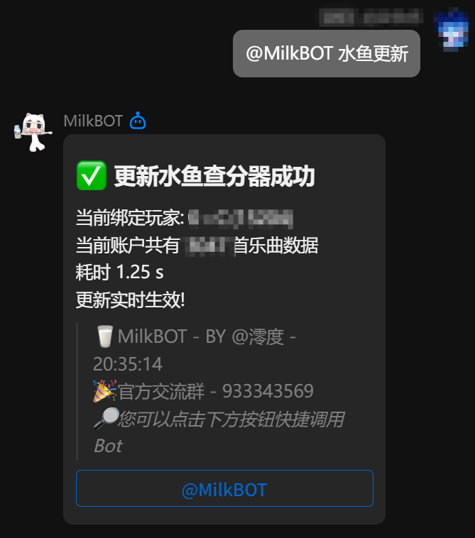 您可以加入 QQ 官方群(1072033605)后,使用"mai绑定水鱼"命令进行更新。